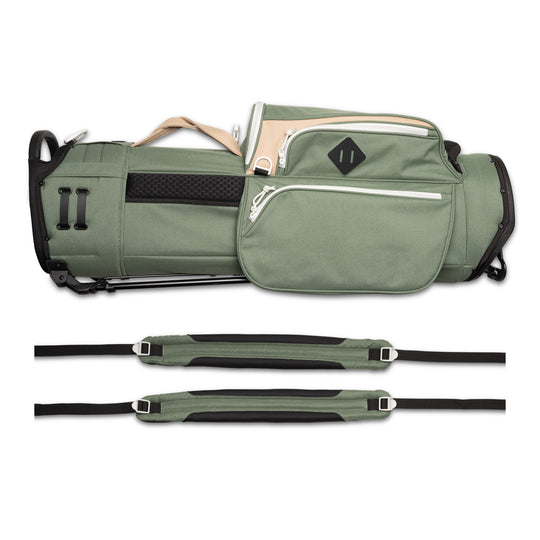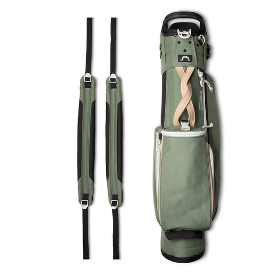 Designed with a versatile single or double shoulder strap configuration the Trouper 3.0 is your ideal companion on the course. A large insulated front cooler pocket has enough space to keep four 16oz cans cold. The two newly improved fleece-lined valuable compartments and seven-pocket design secures valuables while allowing for straightforward access. A large five-way divider allows for simple organization and an easy pull for all 14 clubs even with oversized grips. Simply put the Trouper 3.0 delivers an effortless and reliable experience for any player round after round. Featuring All-New Straps and a bolstered stand mechanism.